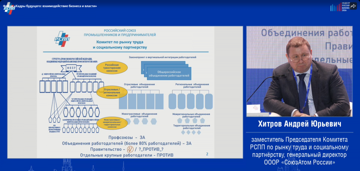 На форуме «Кадры будущего: взаимодействие бизнеса и власти» выступил Андрей Юрьевич Хитров — заместитель Председателя Комитета РСПП по рынку труда и социальному партнёрству, генеральный директор общероссийского отраслевого объединения работодателей «Союз работодателей атомной промышленности, энергетики и науки России».